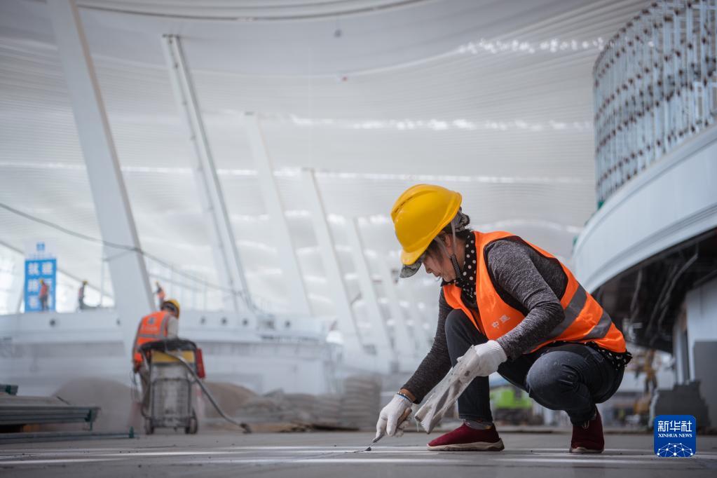 5月1日,在中建三局承建的武漢天河機場(chǎng)T2航站樓改造工程項目工地,工人在進(jìn)行樓地面施工作業(yè)。
