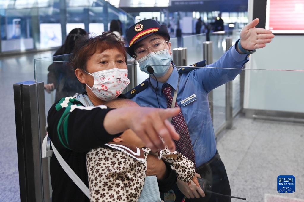 5月1日,在杭州東站候車(chē)大廳,客運員陳思悅引導旅客前往檢票口。