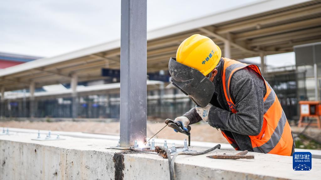 5月1日,中鐵建工集團工人在貴州貴安新區貴安站擴建項目工地施工。