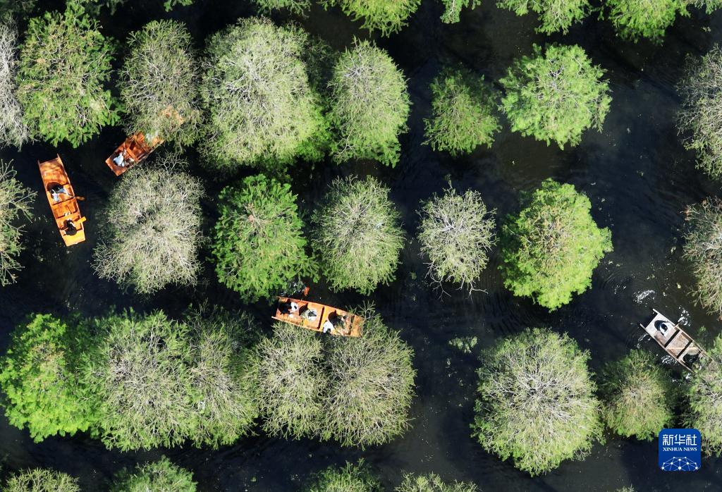5月1日,游客在江蘇省揚州市淥洋湖濕地公園的水上森林乘船游覽(無(wú)人機照片)。