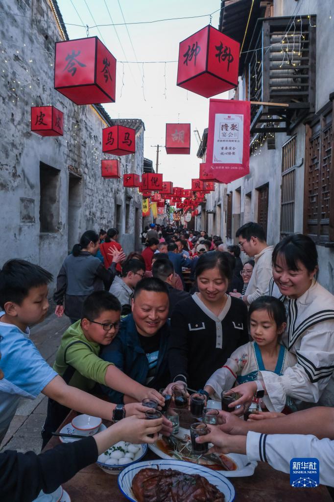 5月1日,在浙江嘉興桐鄉市崇福鎮運河文化歷史街區的橫街上,游客參加古鎮特色長(cháng)街宴。