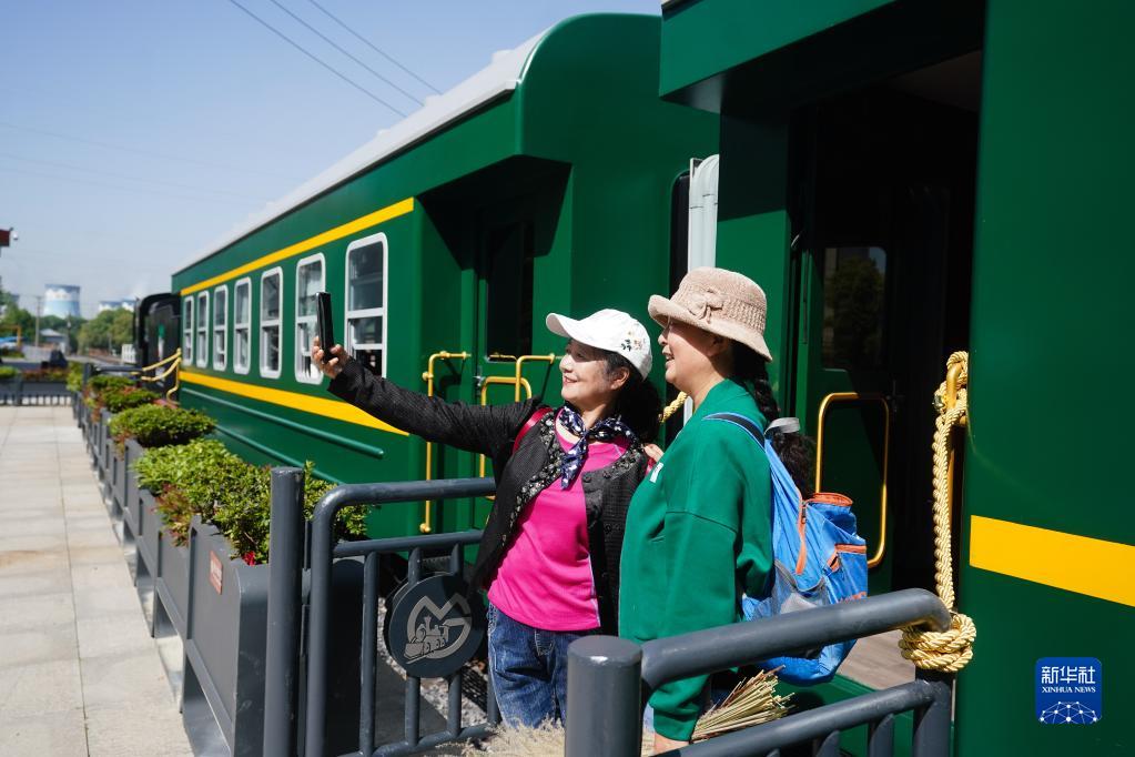 5月1日,游人在“梅鋼號”觀(guān)光車(chē)前自拍留影。