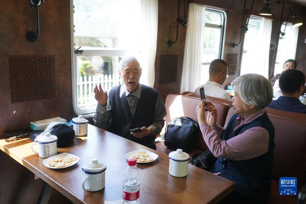 5月1日,游人在“梅鋼號”觀(guān)光車(chē)上唱懷舊歌曲。