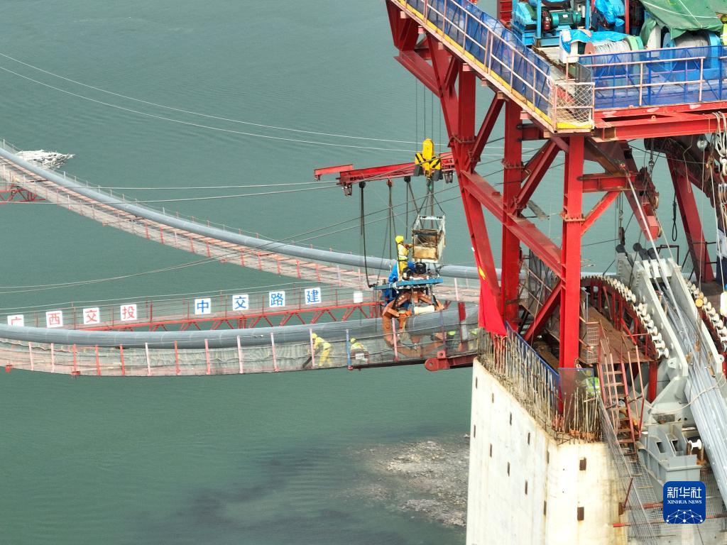 工人在廣西龍門(mén)大橋項目建設工地進(jìn)行主纜緊纜施工(5月1日攝,無(wú)人機照片)。