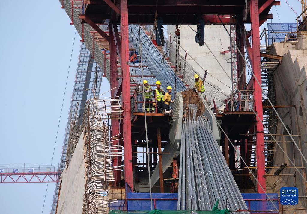 工人在廣西龍門(mén)大橋項目建設工地進(jìn)行主纜緊纜施工(5月1日攝)。