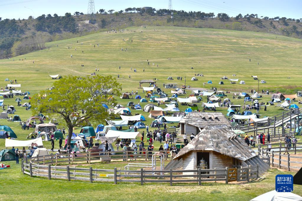 5月1日,游客在遼寧省大連市三寰牧場(chǎng)景區搭帳篷露營(yíng)。