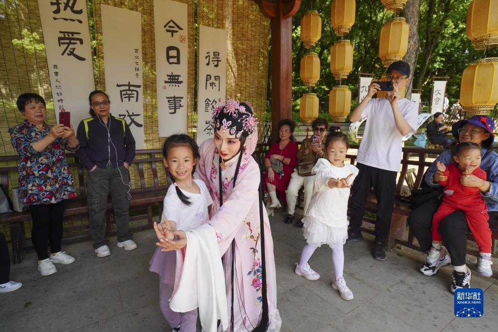 4月30日,在浙江省溫州市鹿城區松臺山腳下,戲曲演員與游客們互動(dòng)。
