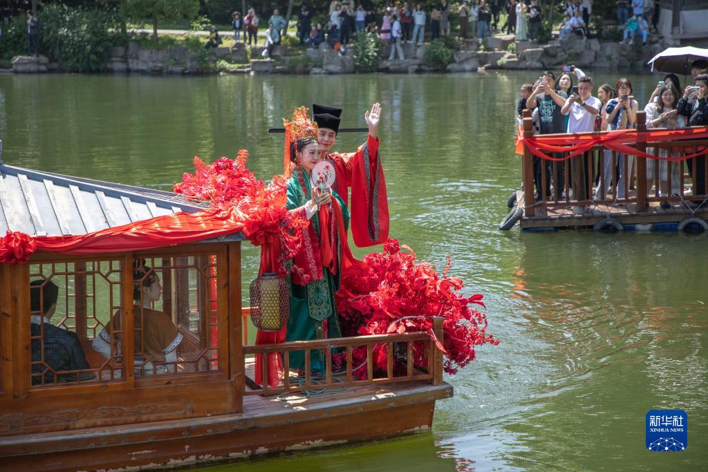 4月30日,在浙江省臨海市,一場(chǎng)水上傳統習俗婚禮演出在東湖公園上演。