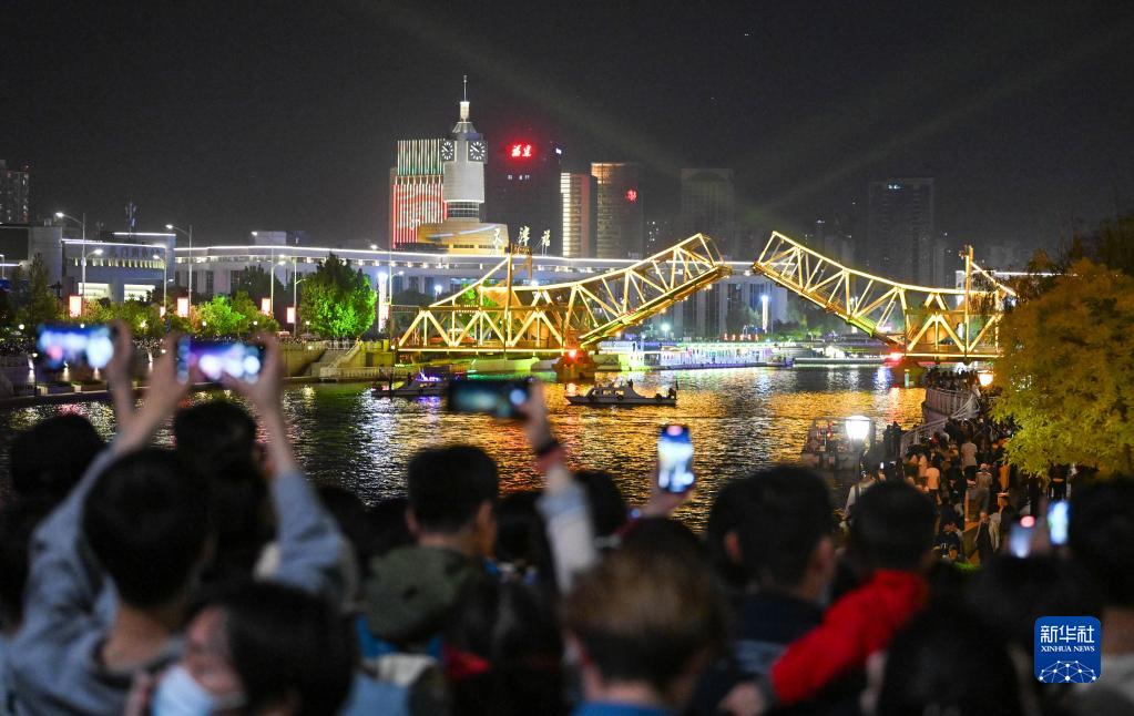 天津解放橋開(kāi)啟扮靚“夜津城”