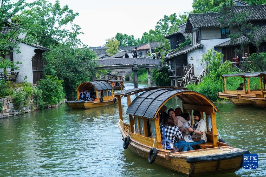 5月2日,游客在濮院時(shí)尚古鎮內乘船游覽。
