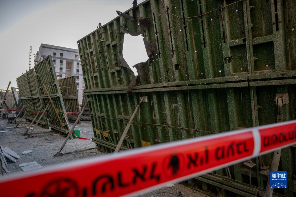 這是5月2日在以色列南部城市斯代羅特拍攝的一處遭火箭彈襲擊的建筑工地。