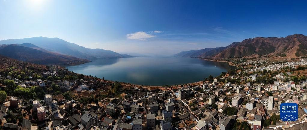 云南省麗江市永勝縣的程海湖似一顆藍寶石鑲嵌在大地上(5月1日攝,無(wú)人機全景照片)。