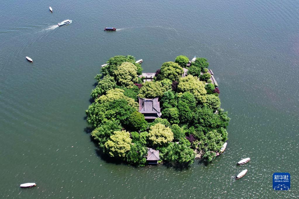 5月1日,游客乘坐游船游覽杭州西湖(無(wú)人機照片)。