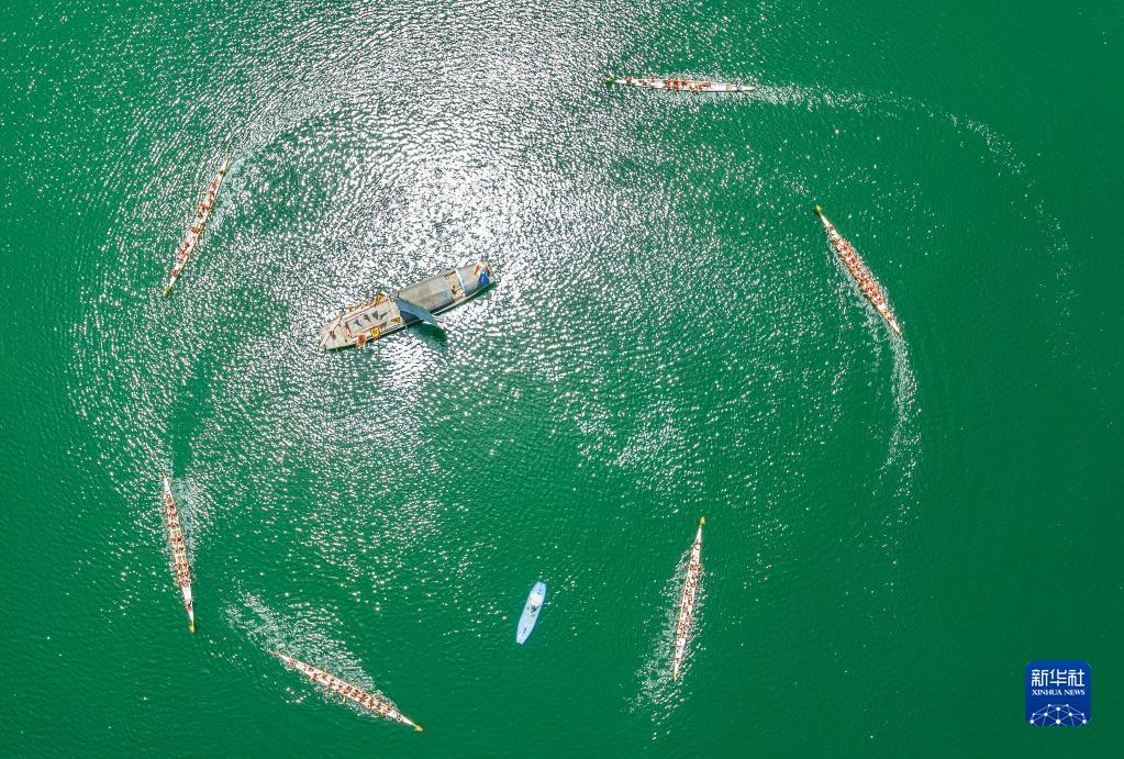 5月1日,湖北省宜昌市秭歸縣歸州鎮萬(wàn)古寺村村民與游客共同劃龍舟(無(wú)人機照片)。