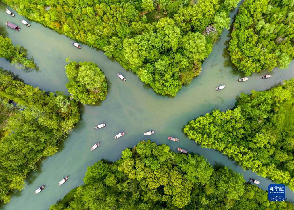 5月2日,游客在江蘇省泰州市姜堰區溱湖國家濕地公園內乘坐搖櫓船游玩(無(wú)人機照片)。