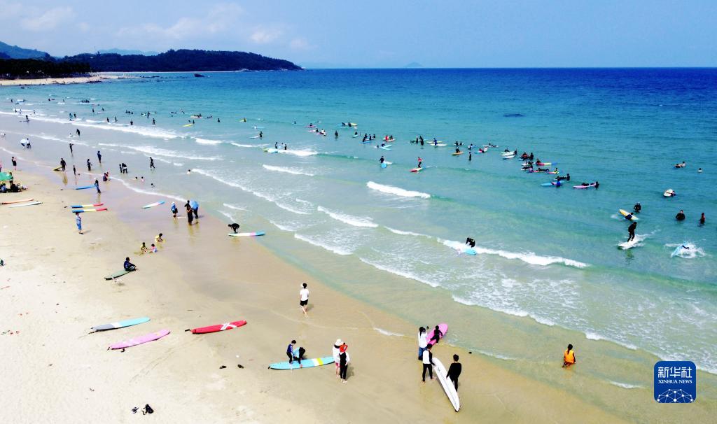 5月1日,游客在海南省萬(wàn)寧市日月灣國家沖浪基地沖浪、休閑(無(wú)人機照片)。
