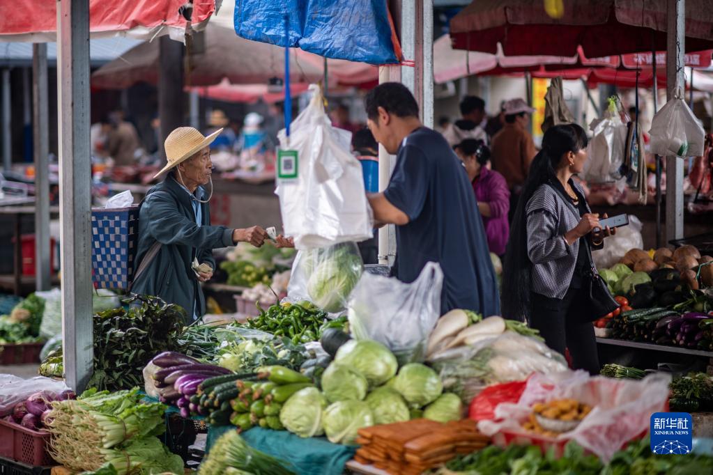 5月3日,村民在云南省保山市隆陽(yáng)區瓦窯鎮集貿市場(chǎng)購買(mǎi)新鮮蔬菜。