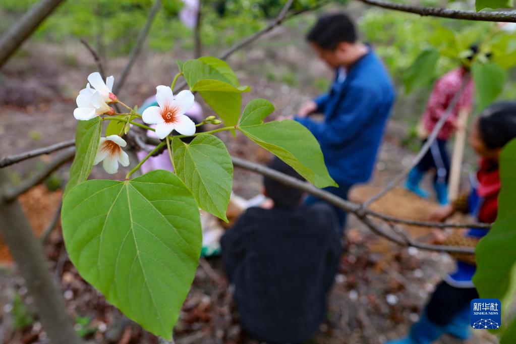楊安仁和工人在油桐種植基地栽種油桐樹(shù)苗(4月17日攝)。