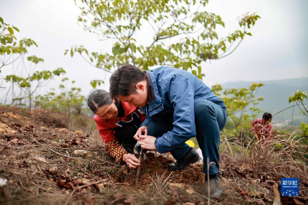楊安仁(前右)和工人在油桐種植基地栽種油桐樹(shù)苗(4月17日攝)。