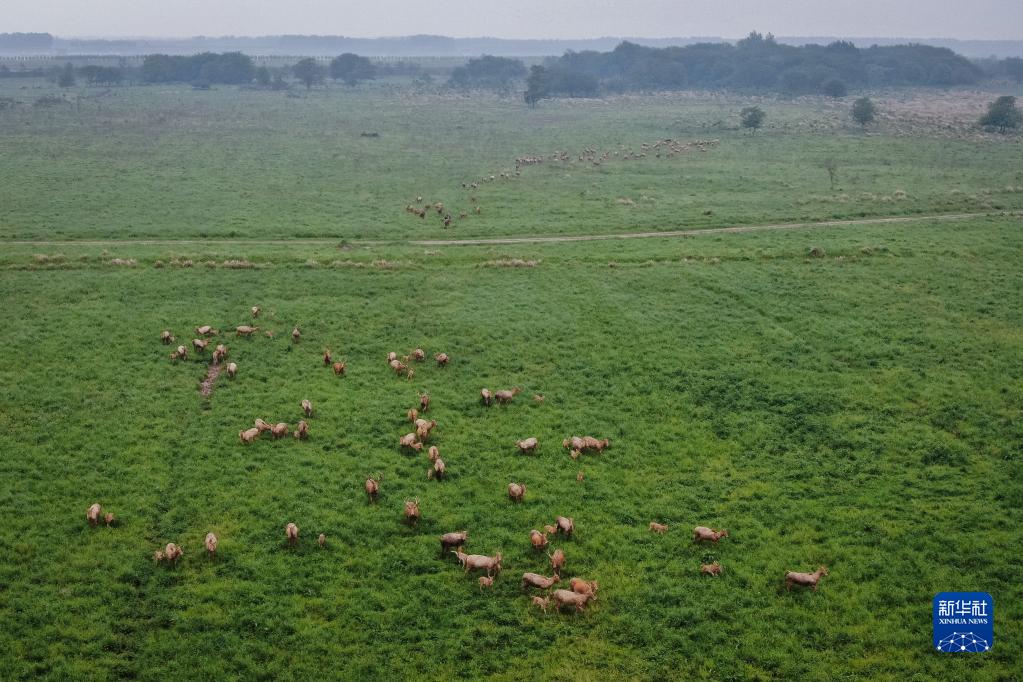 4月28日,一群麋鹿在石首麋鹿國家級自然保護區活動(dòng)(無(wú)人機照片)。