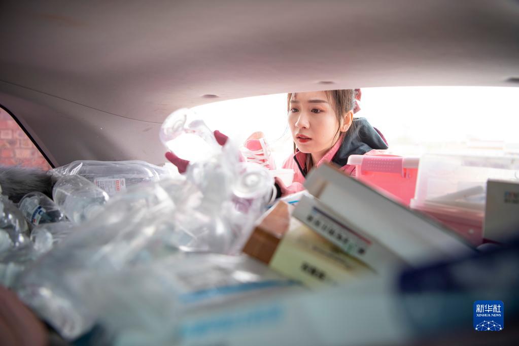 白婳從汽車(chē)后備箱里找取藥品(4月18日攝)。