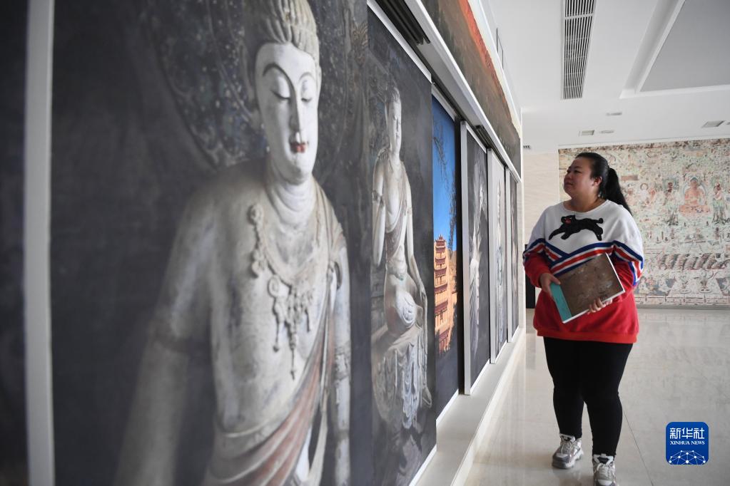 敦煌研究院文物數字化保護團隊圖像處理人員年海麗從莫高窟照片墻前走過(guò)(4月25日攝)。