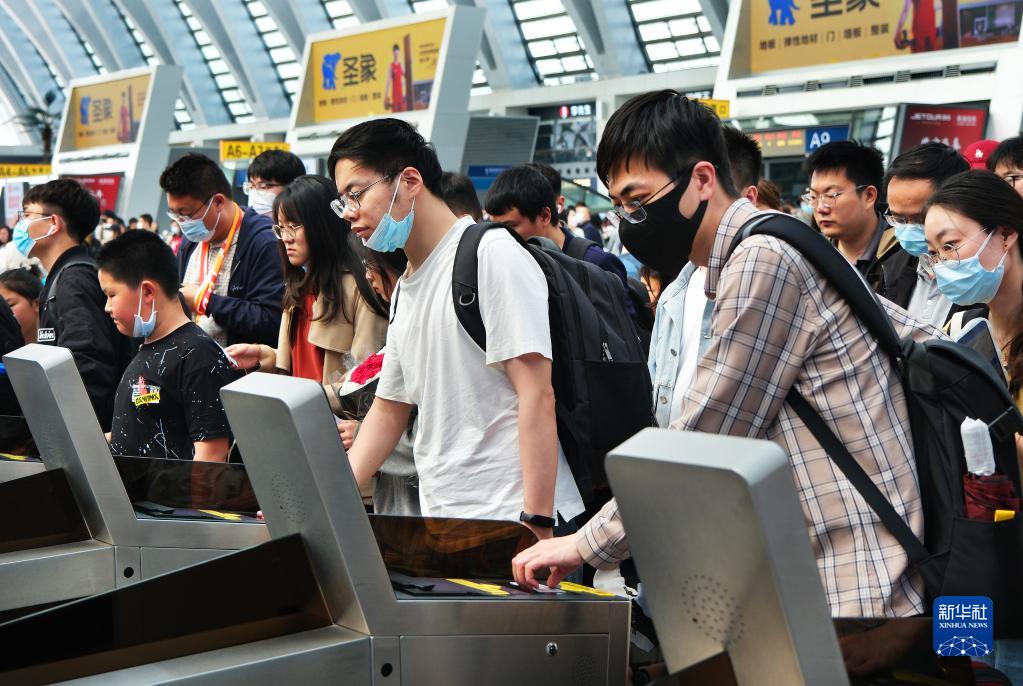 5月3日,旅客在天津西站通過(guò)檢票口準備乘車(chē)。