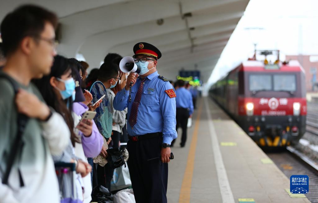 5月3日,在山東滕州火車(chē)站,值班站長(cháng)在站臺維護乘車(chē)秩序。