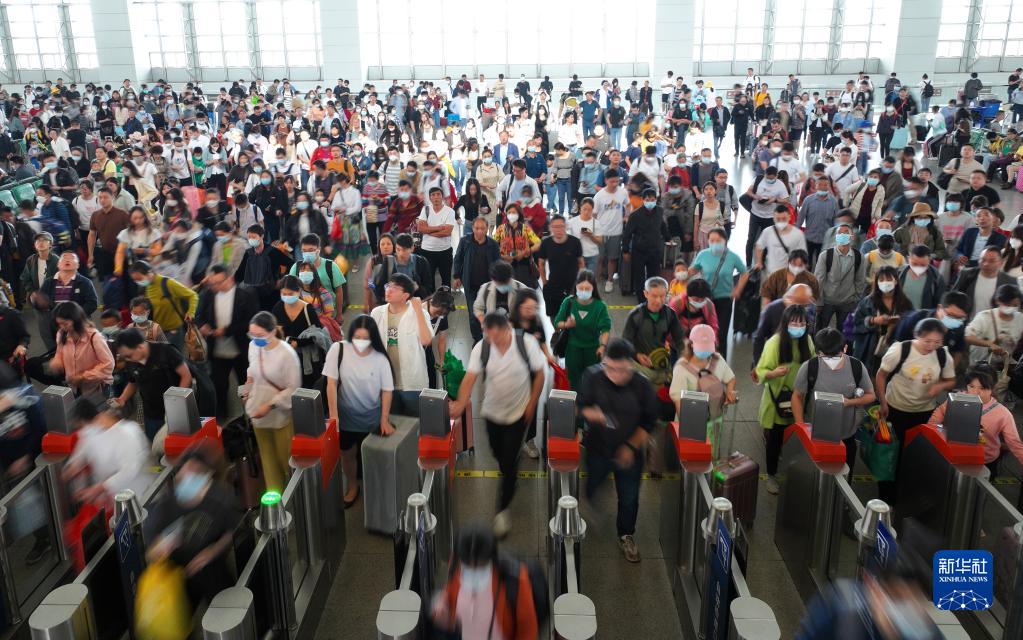 5月3日,在湖南衡陽(yáng)東站,旅客經(jīng)過(guò)閘機驗票準備上車(chē)。