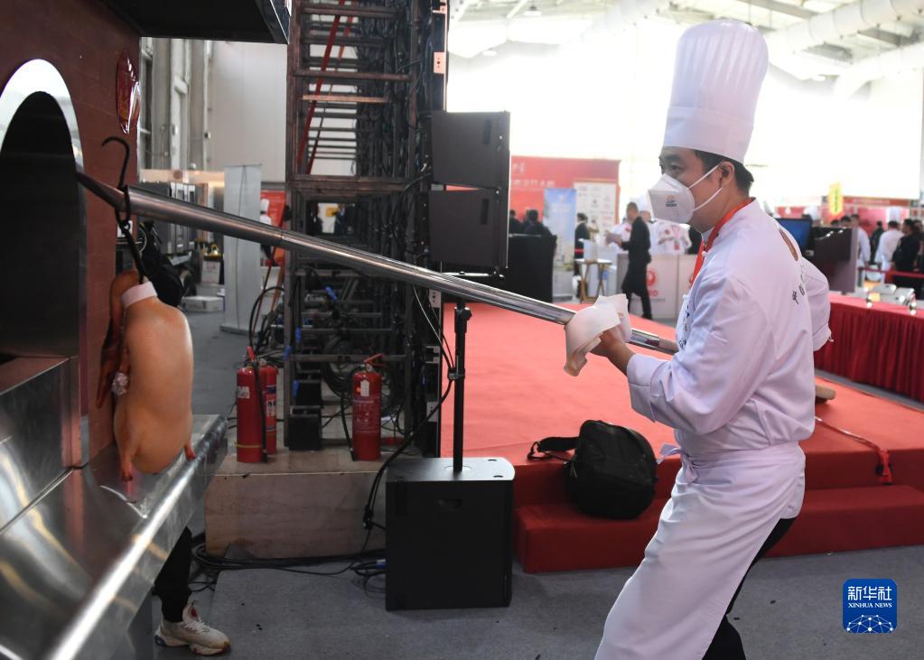 夏志鵬在2023中國首屆烤鴨技能烹飪大賽中烤制鴨坯(4月24日攝)。