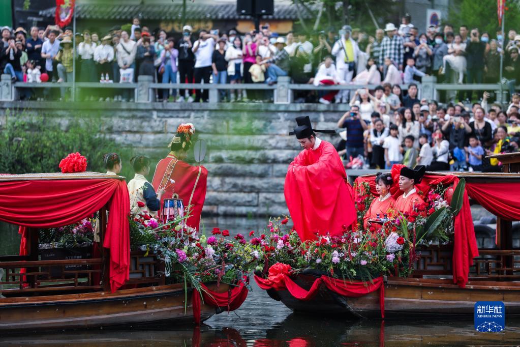 當日,浙江省建德市梅城鎮嚴州古城舉行宋韻水上婚禮表演,通過(guò)出閣、梳妝、登船、親迎、禮拜的五幕演繹,吸引了人們駐足觀(guān)禮。有著(zhù)1000多年歷史的嚴州古城地處新安江、富春江、蘭江交匯處,歷史文化積淀深厚。
