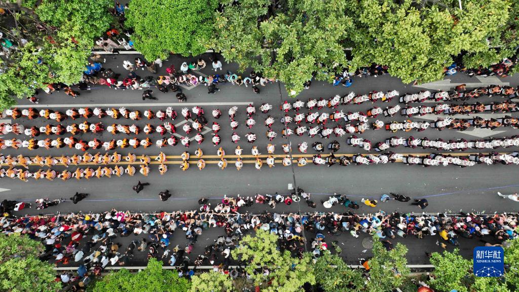 5月2日,人們在貴州省臺江縣參加苗族姊妹節盛裝巡游(無(wú)人機照片)。