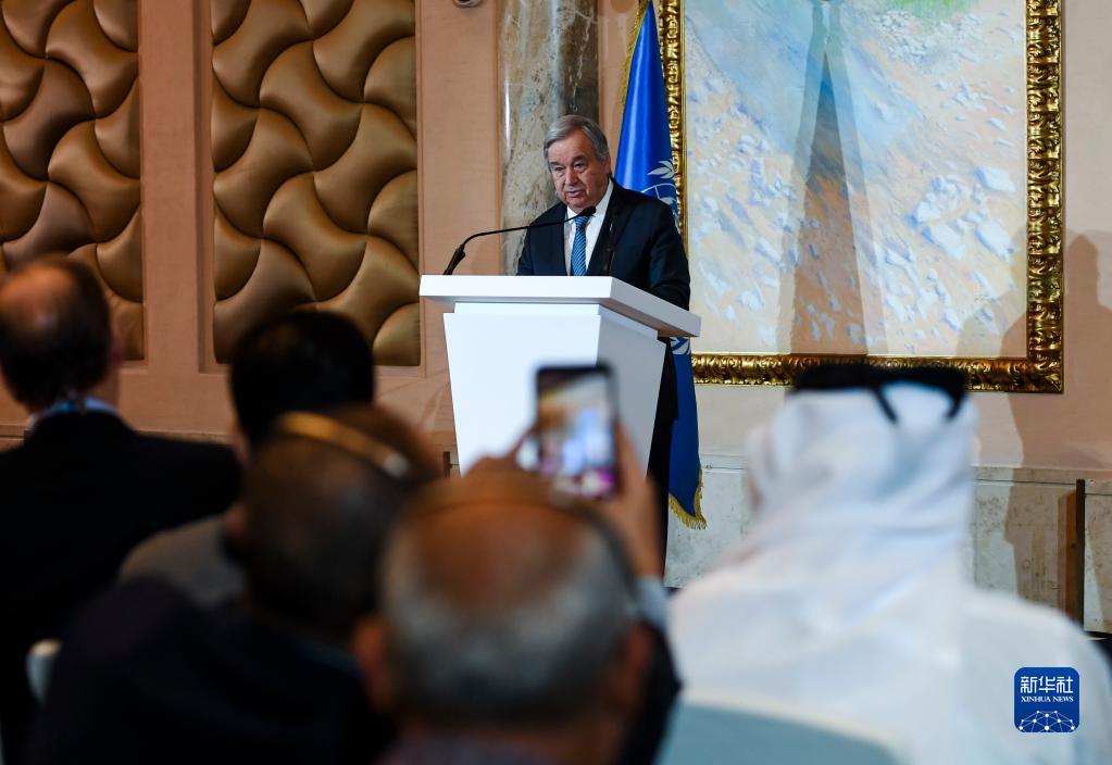 5月2日,聯(lián)合國秘書(shū)長(cháng)古特雷斯在卡塔爾首都多哈發(fā)表講話(huà)。