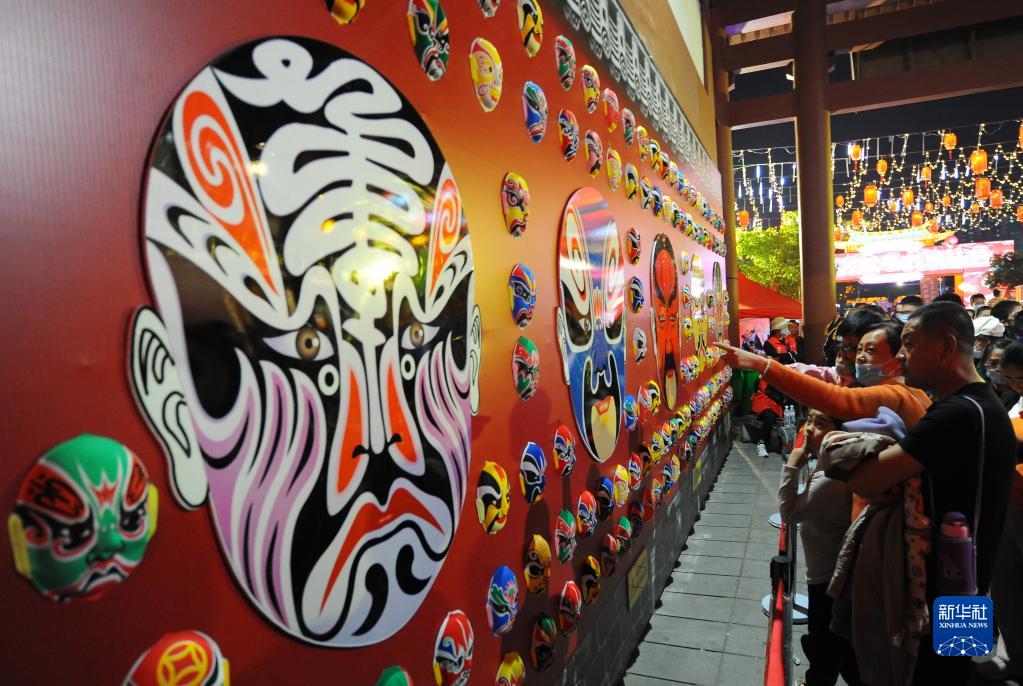 4月30日,游客在山東省滕州市“黃河大集·龍泉廟會(huì )”上觀(guān)賞京劇臉譜。