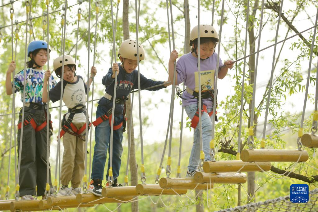 5月1日,在天津市薊州區下?tīng)I鎮郭家溝景區內,孩子們體驗繩索挑戰項目。