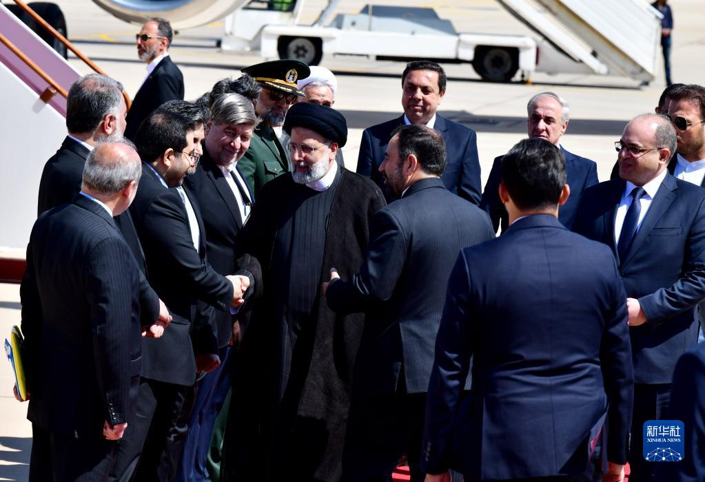 5月3日,伊朗總統易卜拉欣·萊希(中)抵達敘利亞大馬士革國際機場(chǎng)時(shí)與敘方人員握手。