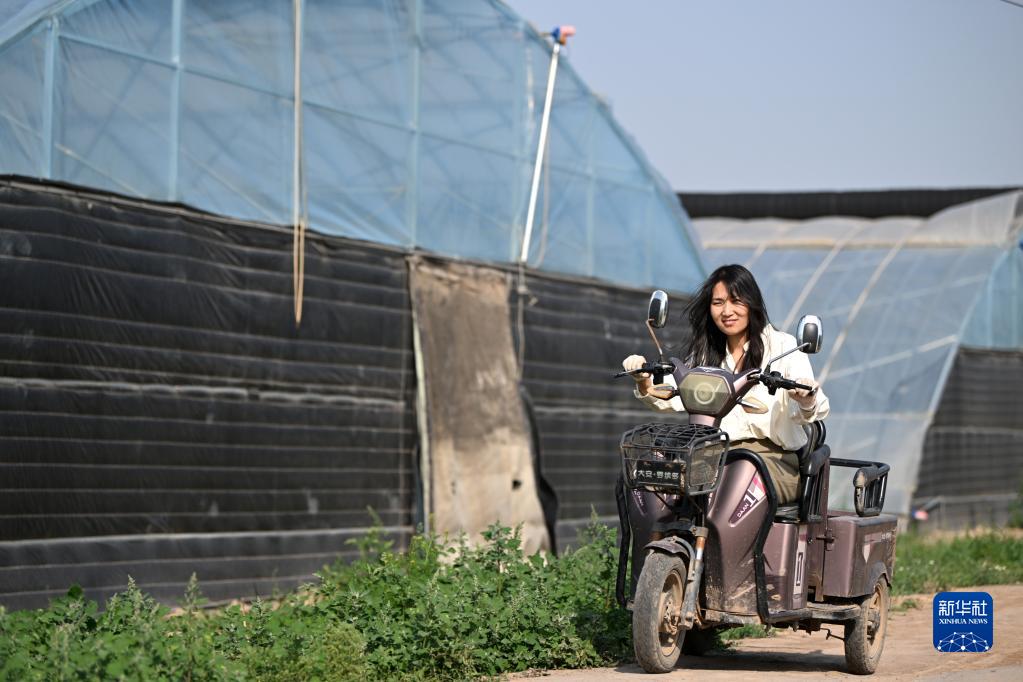 呂欣駕駛著(zhù)三輪車(chē)在家庭農場(chǎng)里運送藍莓(5月3日攝)。