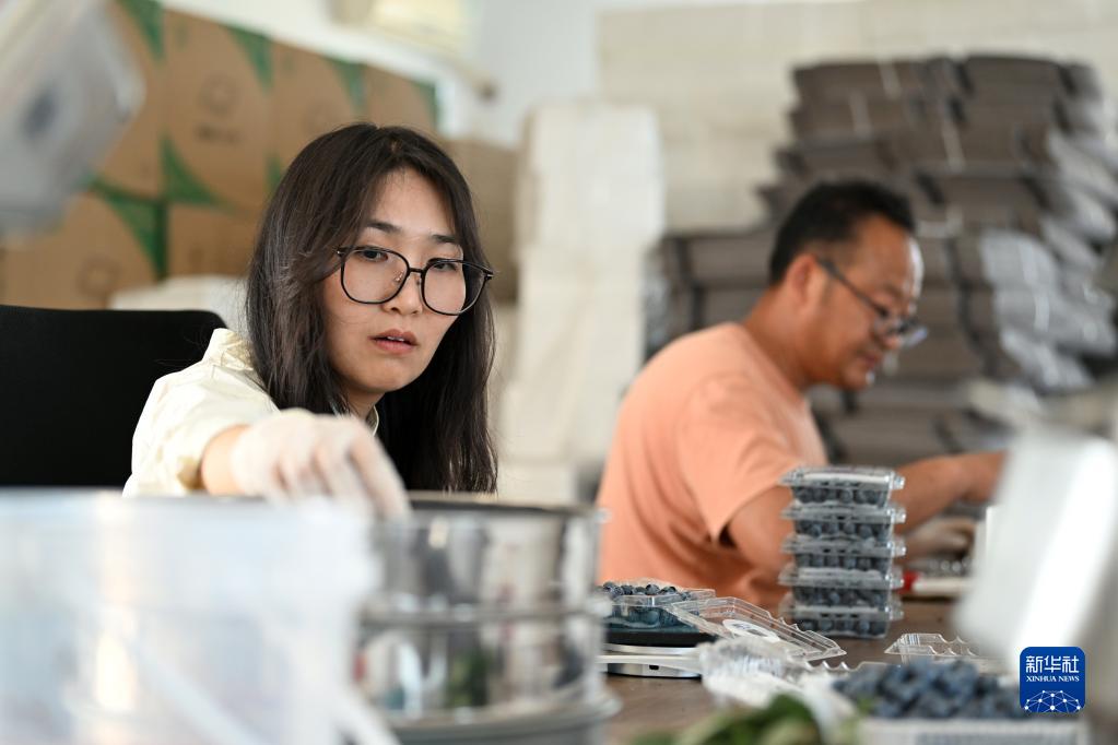 呂欣和丈夫馮愛(ài)喜一起包裝剛采摘的藍莓(5月3日攝)。