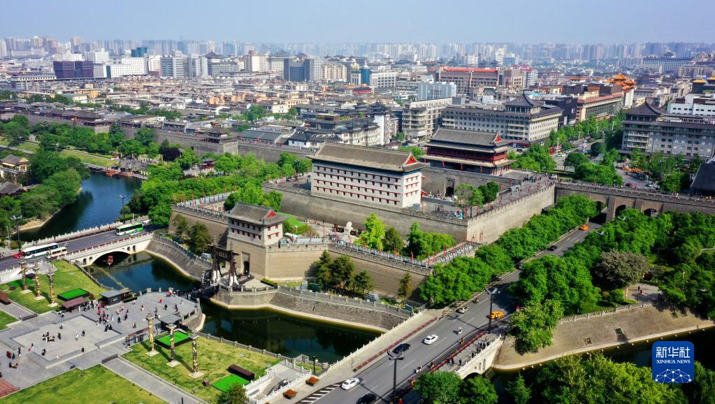 西安城墻景區永寧門(mén)(4月25日攝,無(wú)人機照片)。