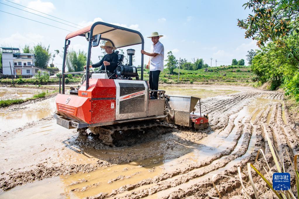 5月4日,在重慶市合川區淶灘鎮碾盤(pán)村,農民操作直播機進(jìn)行播種作業(yè)。