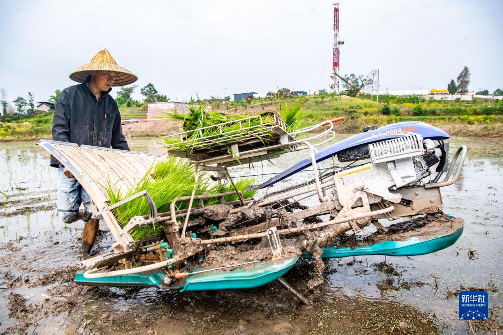 5月4日,在重慶市合川區大石街道龍骨村,農民操作農機插秧。
