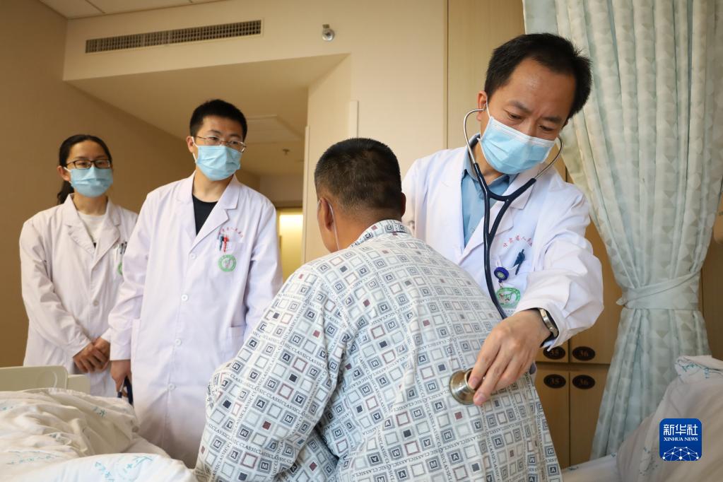 5月4日,曹云山(右一)與團隊成員在病房?jì)葹榛颊邫z查。