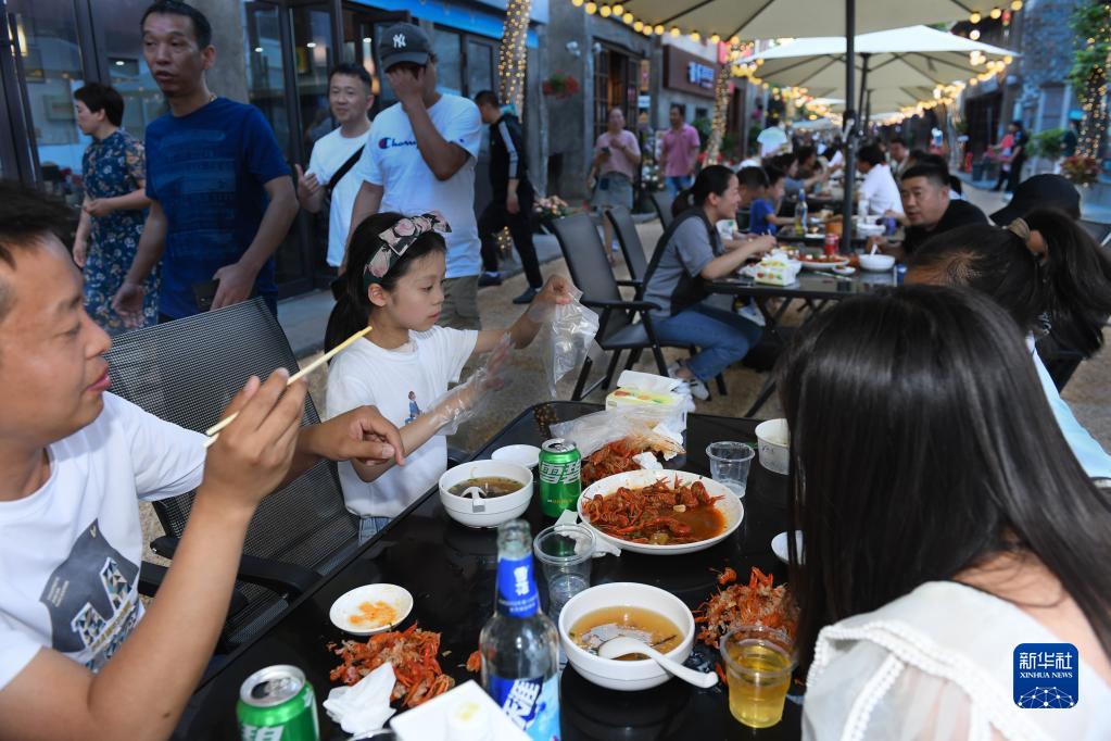 5月4日,人們在新昌縣小吃集聚區南街“碳水王國”享用美食。