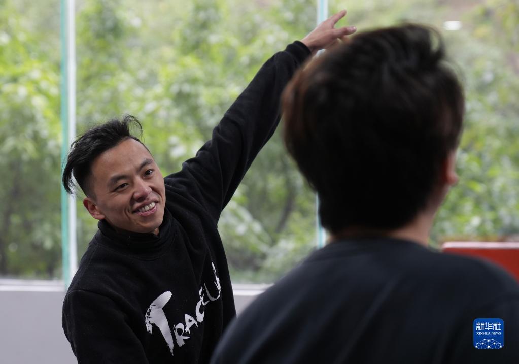 2023年2月23日,文舜堯在重慶躍飛跑酷俱樂(lè )部?jì)扰c同事一起討論教學(xué)內容。