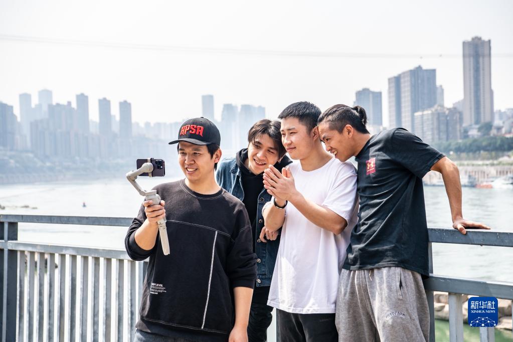 2023年3月14日,在重慶東水門(mén)長(cháng)江大橋下的濱江路,文舜堯(右一)和重慶躍飛跑酷隊員們回看拍攝的跑酷視頻。