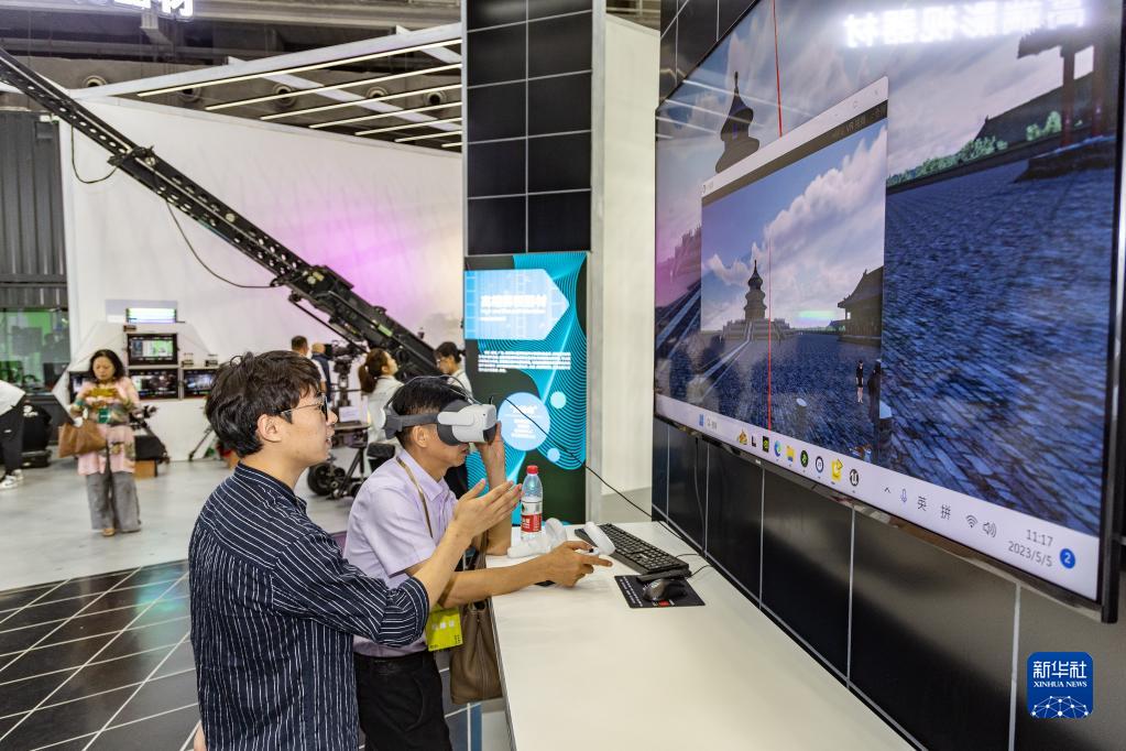5月5日,在中國影視科技創(chuàng )新成果展上,嘉賓利用VR設備體驗元宇宙場(chǎng)景。