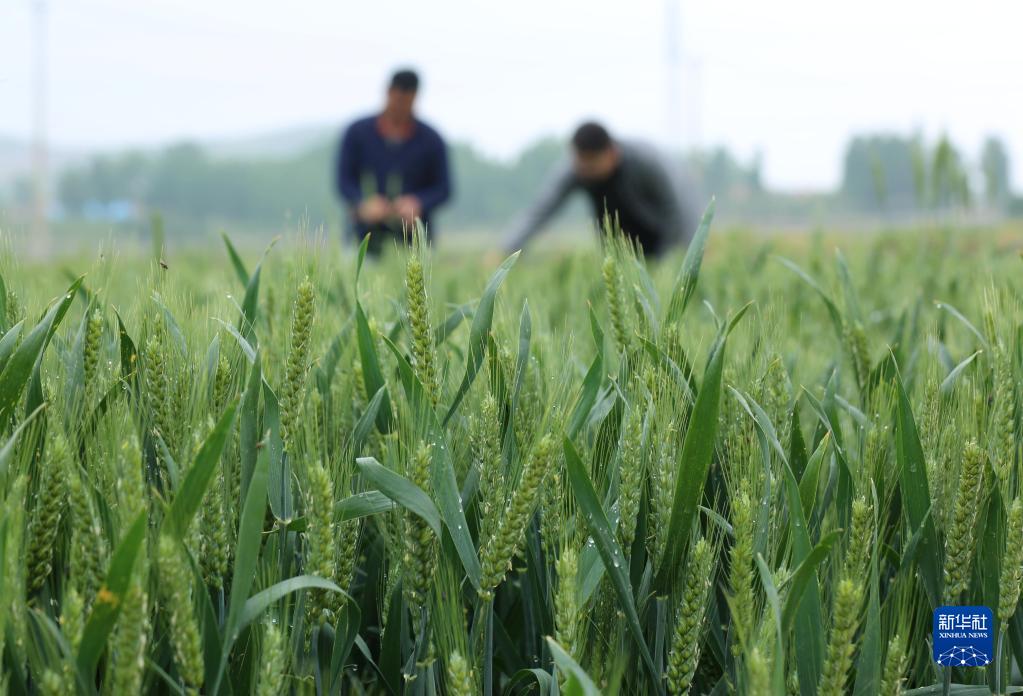 5月5日,山東省臨沂市沂南縣銅井鎮黃元村農民在查看小麥長(cháng)勢。