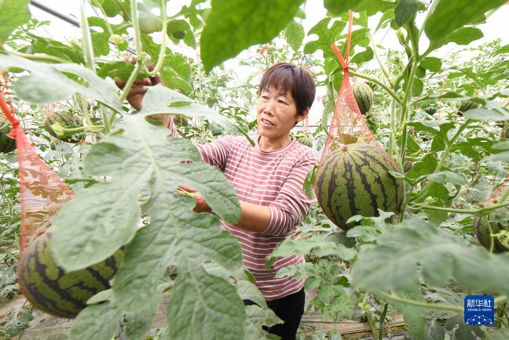 5月5日,瓜農在河北石家莊新樂(lè )市邯邰鎮小流村管理吊蔓西瓜。