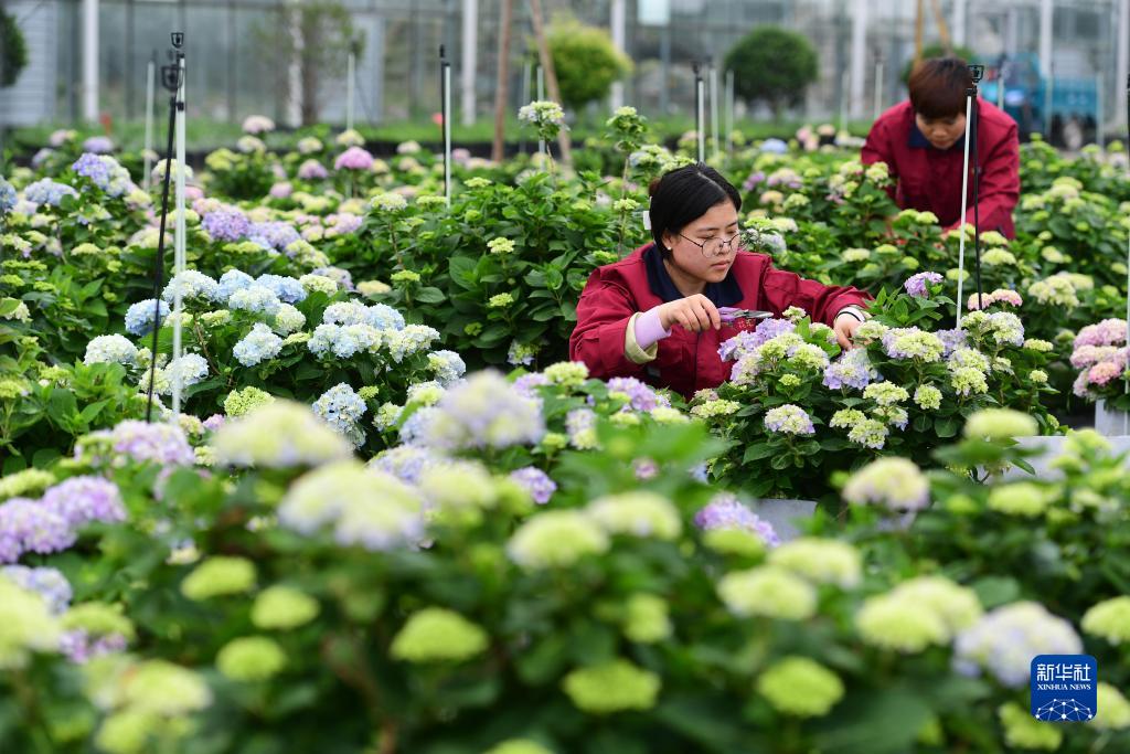 5月5日,在肥西縣經(jīng)開(kāi)區一家農林科技企業(yè),員工在花卉種植基地打理繡球花。