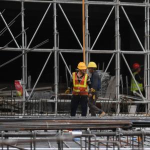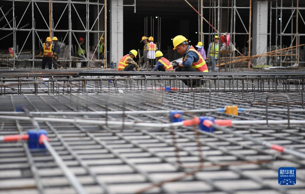 5月5日,在廣州黃埔區的中山大學(xué)附屬第三醫院嶺南醫院二期項目,工人在捆扎鋼筋。
